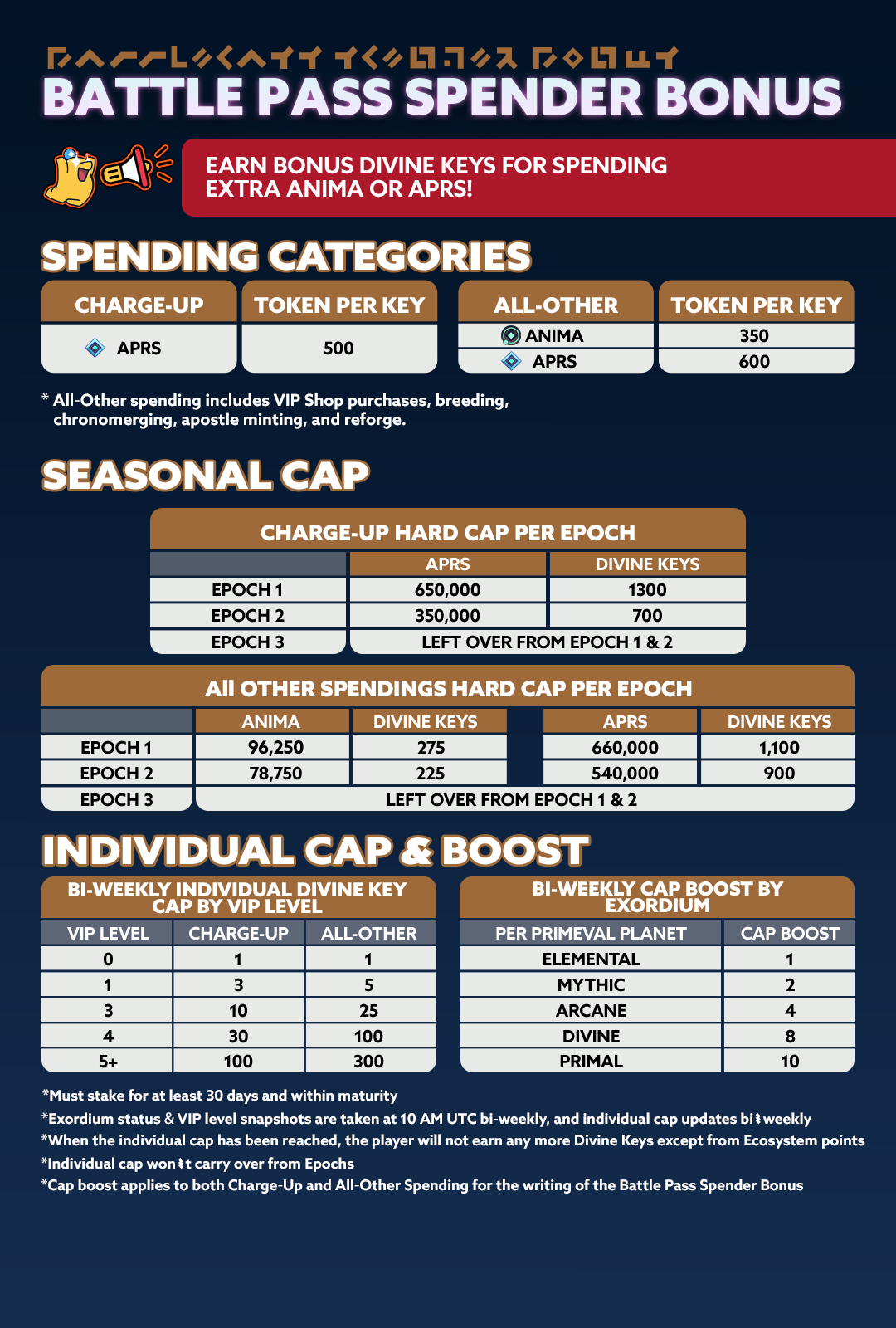 We’ve also updated the “Spender Bonus”: a hard cap will now be set on the number of Divine Keys that can be earned every two weeks (both in total and individually). A player’s cap is determined by their staking level and primeval planets held: